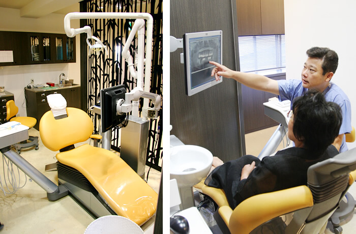 モニターでレントゲンの画像や症例写真、現在の口腔内の様子などを、分かりやすくご説明しながら診療を進めて参ります。お一人おひとりのスペースを十分にとり、患者様のプライベートを守る空間を作っています。