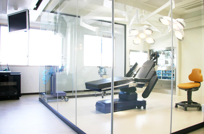 当院の第1オペルームです。心電図や血圧ならびに血液中の酸素飽和度を計測するサチュレーションシステム、インプラント治療の為のCT画像を3次元的に再構成してインプラントを入れたときと同じようにシミュレーションすることができるインプラントシミュレーション、細かい手術や歯内療法に用いるマイクロスコープ、レントゲン(CT)室・消毒室・相談室などの設備を備え、より良いインプラント治療を提供できるよう努めています。オペルーム外の研修スペースは、歯科技術向上のため、患者様の同意を得たうえでオペ中に他の医師に解説できるスペースとなっております。