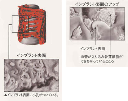 初めてブローネマルク・システムによる治療を受けたのはヨスタ・ラーソン氏ですが、彼のインプラントは亡くなるまでの40年間、問題なく機能したそうです。当時のインプラントと現在のインプラント(即時負荷ができる)とはどこが異なっているのでしょうか。喪失した歯を人工歯根で補うという目的から考えると、たとえ40年前といってもそれは変わりません。しかし「インプラントを入れたその日から噛める」というオールオン4が開発された今、治療期間に短縮という決定的な相違点が生まれています。かつては「ブレードインプラント」という形のインプラントが使われていました。板状の形で歯骨に平行して埋入するというものでした。その後、形態は物理的に締めて止めることができるネジに改良されています。しかしあくまでも、それはぐらぐらしないように機械的に締めるという作業です。インプラントが骨と融合するまでにネジのプレッシャーが解けると多少緩んでしまいます。そこで力を発揮するのがインプラントの表面処理です。ネジ山をはじめ細胞と密着する前にザラザラとしたタイユナイト処理という加工をほどこし、無数の穴をあけています。ザラザラとさせることで表面積が増し再生細胞を取り込みやすいようにしたのです。また、ミクロ性状により、血中のタンパク質を吸着し血小板を活性化させて歯骨と一体化するスピードが非常に速くなりました。その結果、即時負荷(埋入した直後に負荷をかけること=食べ物を噛むこと)が可能になりました。つまりオールオン4に使用するインプラントの表面には、オッセオインテグレーションの複雑な過程を促進させる性質や状態が、最大限に結集されているのです。