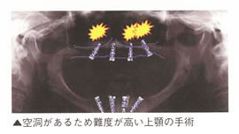 即時加重(直ぐ噛めるということ)ができるオールオン4の施術に関するポイントはなんでしょう。それはインプラントに傾斜角度をつけて埋入することです。垂直ではなく角度をつけて埋入することで、より後方にインプラントのヘッドを出すことになります。すでに何度か説明をしていますが、前歯と臼歯の部位に埋入したインプラントヘッドの4点を結ぶと四角の面ができます。この面が広ければ広いほど安定した力で義歯を支えることになります。傾斜をつけてより奥にヘッドを出すことで最大限の面積を作るわけです。また、インプラントの表面加工も進化し骨と速やかに融合する工夫が凝らされていますから、仮歯をセットしたらすぐに噛める状態になるのです。ただしここで重要なポイントは、上・下顎に角度をつけて埋入する作業が、非常に繊細で適切な技術を要するということです。とくに上顎には頬骨や鼻腔があり、複雑な構造となっています。安全な手術を完璧に行うためには医師の技術だけでなく、医療施設の整備が絶対に必要です。つまりオールオン4の施術に関するポイントはCTスキャンの設置や滅菌室、麻酔システムなどの整備がかかせないということにあるのです。逆に言えば、それらのハード面が整った環境であれば安心して任せることができるというわけです。もちろん日々の技術の習得への努力というソフト面での充実も欠かせません。 手術を行うためには医師の技術だけでなく、手術を適切に行うために医療施設の整備が絶対に必要です。