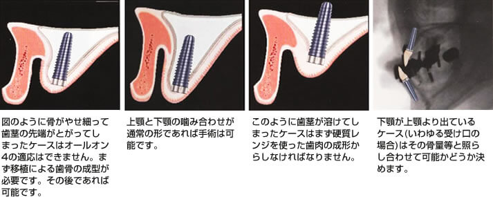 オールオン4も万能ではなく、顎骨の形態や骨量によっては、すぐにできない場合もあります。ご自分のケースはオールオン4が可能かどうか、どうぞ遠慮なくお尋ね下さい。通常のインプラントの適応となるか、オールオン4が適応できるか、多角的な検査から確実に診断いたします。